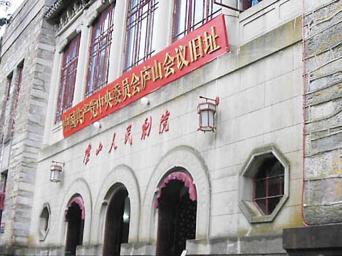 “跃上葱茏四百旋”。一条云铺雾绕的路,沿着庐山的伟岸身躯,逶迤曲折,通往云雾深处的掷笔峰 下,一幢布局严谨对称,气氛庄严肃穆的建筑,便呈现在你的面前。这就是“庐山会议”旧址。 这幢建筑的始建于1935年,1937年竣工。系民国时期“庐山三大建筑(传习学舍、图书馆、庐山大礼堂)”之一----庐山大礼堂,由中国工程师高观四设计,上海华申公司承建。平面呈“丁”字形,长39.7 米,宽30.9米,高16.8米,上下两层,总建筑面积约4000平方米。单檐铁 瓦。屋面与墙体相接处有1米左右的檐口,覆以蓝色琉璃瓦。房屋四周墙上装有高大钢窗,采光极佳,室内富丽堂皇。建筑坐东朝西。正面建筑处理很有特色,正面入口为三扇拱形大门,与 中国的古城门相似。二楼的正面为五个大型的联为一体的钢窗,在功能上使室内形成封闭式的内廊,同时也体现了建筑艺术的时代气息。整个建筑充分体现了中西合璧的特色,气魄雄浑,格调高迈,显露出沉静、明丽的色彩基调。在湛蓝的天空下,它背依青山,旁临碧溪,耸立在苍松翠柏之中,显得分外的庄严。 这幢建筑自诞生那天起,就闪烁着道道奇异的光彩,为世人所瞩目。蒋介石曾多次在这里向国民党军队的军官们训话,当年这里成了蒋个石培养和训练骨干的重要基地。 新中国成立以后,这幢建筑更名为庐山人民剧院。自1959年开始,中共中央曾在这里召开过三次重要会议,即1959年的中共中央八届八中全会,1961年的中央工作会议和1970年的中共中央九届二中全会。 沿门前石阶步入“庐山会议”旧址大门,迎面可见绛红色帷幕上镶嵌着金光闪闪的“庐山会议会址”6个大字。二楼是影剧大厅和休息室。影剧大厅即是当年“庐山会议”的会场,大会主席台依然保持着当年中共中央九届二中全会时的原貌。休息室则辟为展厅,展示着毛泽东、周恩来、刘少奇、朱德、邓小平、彭德怀等老一辈无产阶级革命家在庐山活动的图文资料。 一部纪录片----《庐山烟云》,将三次庐山会议剪辑汇编,在大厅里循环放映,给参观者以历史感及身临其境之感。 “庐山会议”旧址,1996年被列为全国重点文物保护单位,同时是进行爱国主义教育的重要基地之一,人们到这里,不但感受到庄严、静谧的气氛,而且还能受到党的历史知识教育。