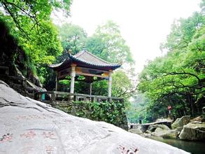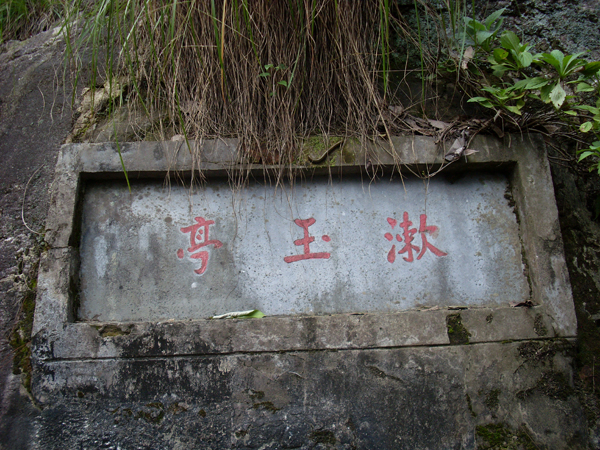 路尽头折向西,只见青玉峡中绿荫蔽天,潭瀑飞溅。龙潭旁耸立着一个四角方亭,这就是大文豪苏东坡叹为庐山两“胜绝”之一的漱玉亭。此外,涧西山坡上有听涛亭。关于漱玉亭的美名,吴崧《游记》中解释道:“亭临涧,二瀑奔赴,汇为潭。下注激石,滢然如玉,漱玉名最称。”漱玉亭为宋僧若遇所建,旧亭已废。今亭石础石柱,风格古朴。颇有意趣的是,亭中四面悬有四首诗,四首诗最后一字都为“中”。朝东的一首是东坡先生著名的《开先漱玉亭》,诗的最后两句为:“手持玉芙蕖,跳下清冷中。”闵麟嗣的诗最后三字为“青玉中”,吴崧的为“冰台中”,李滢的为“寒碧中”。962年,江西省政府主席邵式平作《星子龙潭)诗,最后也用了一个“中”字,诗云:“身坐漱玉亭,面对双剑峰。欲识此间趣,且听龙潭中。”邵式平的夫人胡德兰是星子人,他的诗镌刻在漱玉亭旁的山崖上,为秀峰胜景增添了一段佳话。