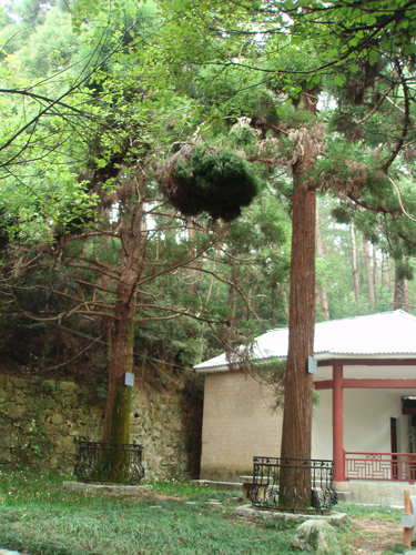 走过昔日的匡山草堂,依山临涧延伸出一条弯曲的长廊。蒋介石当年曾在这里建行宫,并在行宫前与宋美龄一道亲手栽下了两棵“夫妻树”。至今两株杉树已经高达十余米,躯干相倾,枝叶交连,相互依偎着一直走到了今天。“夫妻树”记录了一段特殊的趣事,为观音桥景区增添了一个很有人情韵味的景点。