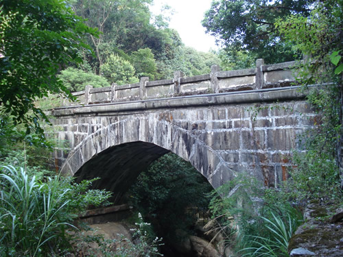 由六泉亭向西就可以看见近在咫尺的观音桥。因为地处山势险峻的栖贤谷,原称栖贤桥;因为横跨断壁悬崖的三峡涧,又称三峡桥。关于观音桥名的来历,吴宗慈《庐山志》载:“土人于三峡桥前立庙,祀奉观音,大著灵应,因又名曰观音桥。”关于观音显灵之说,当地还流传着一个神奇的故事。说的是宋朝大中祥符年间,福州僧德朗、建州僧文秀云游至栖贤寺,固三峡涧经常发洪水,给僧人、施主以及附近的山民带来诸多的困难。于是他们四处募捐,并聘请江州工匠陈氏智福、智汪、智洪三兄弟,准备在涧上建立一座坚固的石桥。在造桥的过程中,刚刚搭起的拱架一次又一次被洪水冲跨。德朗与文秀和尚整夜坐在大殿中念经拜佛,祈求菩萨保佑陈氏兄弟建桥。于是,观音菩萨施展神力,制服了棺材精的破坏。不料石桥即将竣工之际,桥拱上刻有“皇帝万岁”的石块又坠下一截。观音托梦制止官府捉拿陈氏兄弟,并将拱石升复如初。桥建成后,德朗、文秀和尚就把这座桥取名为观音桥,并在桥西修建了一座观音庙。祈求神灵的保佑,只是百姓朴素的愿望。从这个神奇的传说中至少可以看出,在将近千年以前,工匠们以手工凿石建桥曾经遭遇到多么巨大的困难。正是这些土生土长的工匠,依靠自己的智慧与力量创造出了人间奇迹。