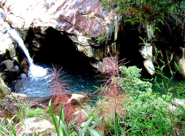 过棺材石、浴仙潭、卧瀑,就来到栖贤二十四潭中最为险峻的玉渊潭。只因潭上有白石横亘中流,色泽如玉,故名玉渊。又有文人解释,这白石形状如羊,当地方言中“如羊”与“玉渊”谐音,如羊潭自然不如玉渊潭美妙,一来二去就说成了玉渊潭。北京的玉渊潭平静光洁,庐山栖贤谷中的玉渊潭却是野性十足,被称为“栖贤伟观”。临涧观潭,只见三峡涧中99水并源合!流,奔注一潭。宋代周必大《后录》描绘玉渊潭,曰:“同观玉渊。先是,涧水奔冲,遇大石上侈下敛,悬瀑射,极其雄壮。涛头瀵涌,散为玻璃色。”也许是光照不足,也许是心理上的恐惧,有游客说玉渊潭怒瀑直插涧底,潭下水色墨黑,汹涌翻滚,深不可测。玉渊潭的确很深,当地人形容说“四两花线打不到底”。后来又有人说:一个日本游人买了一斤丝线,系石探渊,仍旧没有触着潭底。其实古人早已解释过:“沙石万数,古今不塞,诚下通于海矣。”