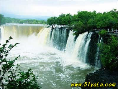 镜泊湖瀑布是让人震撼的,每当夏季洪水到来之时,镜泊湖水从四面八方漫来聚集在潭口,然后蓦然跌下,像无数白马奔腾,十分壮观。呼啸奔腾的湖水漫过平滑的熔岩床面,从断层峭壁上飞泻而下,在丰水期时形成宽达二三百米、落差二十多米的大瀑布,浮云堆雪的奇景让人看了就激动。拥抱洁白瀑布的是黑石潭,赭红色的熔岩将一条河流的急切烘托得无比惊心,那是水与火的妥协,那是冰冷与炽热的生命融合。