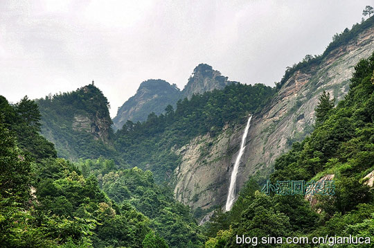 瀑布已经很近了。双剑峰、文殊峰也看不见了。庐山瀑布跌落下来后,稍作喘息,又再一次摔落下来--形成新的瀑布。把此张图片与后两张图片一起看,随着山路不断前行,视觉也不断变化,这个两次跌落的瀑布形状也由错落很深的状态逐渐变成了一条直线。