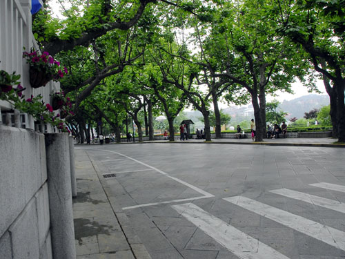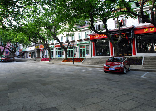 注释:自形成牯岭街以来,牯岭街道路面经过多次改造建设。1954年前,牯岭正街为石板路面,为步行所用。自庐山通汽车后,牯岭正街段扩建为日照峰至良璐宾馆的车行、人行两用道,改原石板为沥青路面。原先的街道路面较为粗糙,防冻性能差,不易维护,近几年又重新铺设了光滑整齐的麻石块。现在的东边的合面街仍是用方块石和长条石铺筑的路面。