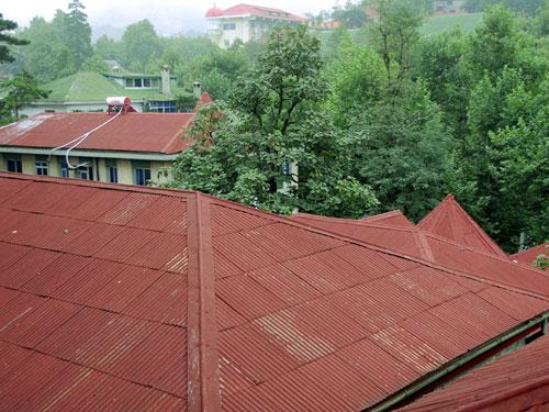 注释:主要原因是由于庐山的冬天冰雪时间较长,屋面易积雪,树上易掉落冰块。如用土瓦和机瓦或水泥浇铸做成的屋面,不能起到防冻和抗击作用,而铁皮的防冻和抗击作用强,不仅防雨,而且还可抗冰块掉落。