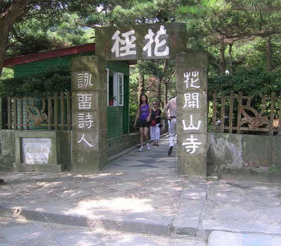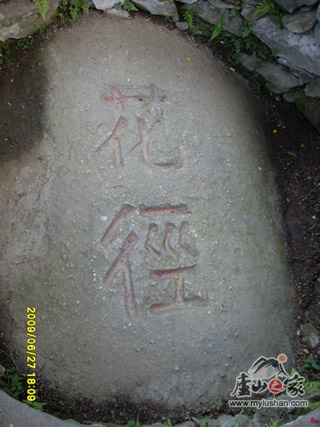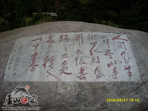 白居易所题“花径”二字,被后人刻在石上,置于花径的,景白亭中他所写的《大林寺桃花》诗,也早已脍炙人口,成为千古绝唱。人们为了纪念白居士游花径,还在花径的石门两侧,刻了一幅对联: