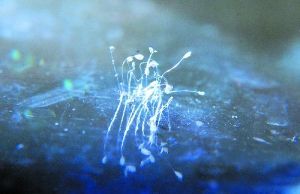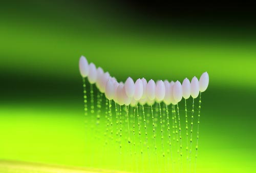 关于草蛉这种奇特生物,在《博物》2007年第8期里也有详细介绍:入夏的城市,总有人在树叶、草棍、窗台、钢管、电线杆上,发现细长的丝状物上面有个小鼓球(如上图所示),这些貌似怪异的东西,有时被当作奇异的真菌,有时被当作上苍的警世,有时出现在香火缭绕的寺院,便被称为“优昙婆罗花”,传说三千年一开花的,是祥瑞之征兆,其实只要略熟悉昆虫,对此物就会见怪不怪,只是草蛉产的卵而已。草蛉捕食害虫,算是该被人类亲之近之的虫子,它们如同蜻蜓一般,拥有漂亮的复眼;在绿化完备的城市里,夏夜的草丛中常会看到草蛉略显柔弱的身影。草蛉产卵时分泌黏液,制成细细的丝状长柄,用以把卵悬挂。