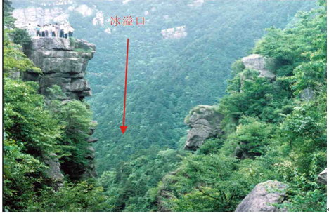 天桥冰溢口位于西谷U形谷与锦秀谷冰川U形谷之间。西谷中的冰流从天桥冰溢口流入锦秀谷中。冰后期流水再将冰溢口侵蚀威一个天生石桥,天桥于6 3 0年前垮塌。