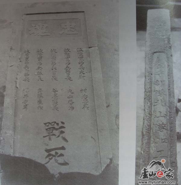 此碑为花岗行制成,碑下部已残破。现藏于庐山文物管理所。残碑高115厘米,宽100厘米,厚22厘米。碑正面磨平留8厘米宽边框。碑名忠魂”阳刻惜书横写。碑正定楷书阴刻竖号“故陆军步兵大尉村治丰作,故陆军步兵曹长丸山启治,故陆军步兵曹长谷泽盛义,故陆军步兵伍长齐藤库作,故生军步兵三等兵樱井光男,战死”。碑侧阴刻带书写“金守部队北山队加工”,字径10厘米。
