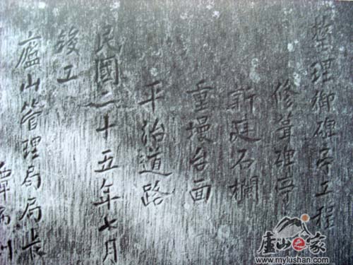 整理御碑亭工程修茸碑亭,新建石栏,重墁台面,平治道路,民国二十五年七月竣工。庐山管理局局长谭炳训