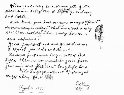 8月30日上午,县长张国猷在家中接见了飞行员们,并代表所属地的政府和人民对飞虎队空中扬威,打击日寇表示感谢,还同他们讨论了回桂林的日程和路线,气氛很活跃。午饭后飞虎队员要求我父亲及偷渡的游击队员合影留念,并请我父亲题词。下午母亲准备了一大包点心送给美国飞行员,我眼馋地摸了一下,险遭母亲一巴掌,她对飞行员说:“你们到中国帮我们打小日本,辛苦了!这点心表示我们的一点心意。”