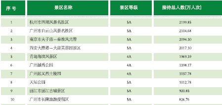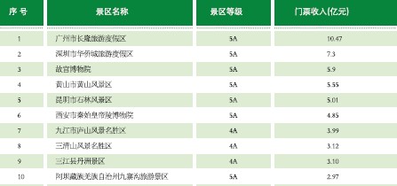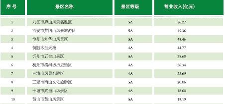 其中,营业收入前10名的全国A级旅游景区分别是,九江市庐山风景名胜区、吉安市井冈山风景旅游区、池州市九华山风景区、黄坡木兰天池、沂州市五台山景区、杭州市清河坊历史街区、三清山风景名胜区、三亚市南山文化旅游区、十堰市武当山风景区、黄山市黄山风景区。