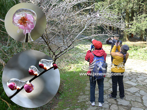 从1日晚开始,庐山就出现了冰冻。2日和3日,庐山的树木上仍是冰挂。在白居易咏桃花的花径公园里,梅花和其他树木花草上凝结了雾凇雨凇冰挂,如水晶一般,显得十分迷人漂亮。 文/图 秦永言